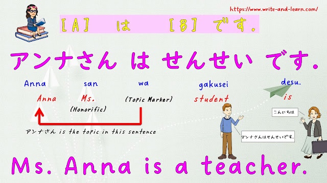 (Mrs., Sir, Ma’am). In this sentence, we’ll translate it as Ms. So, アンナさん is Ms. Anna